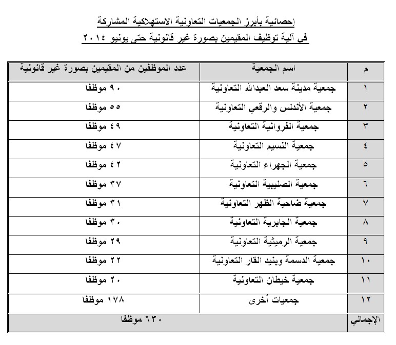 إحصائية بأبرز الجمعيات التعاونية الاستهلاكية المشاركة في آلية توظيف المقيمين بصورة غير قانونية حتى يونيو 2014