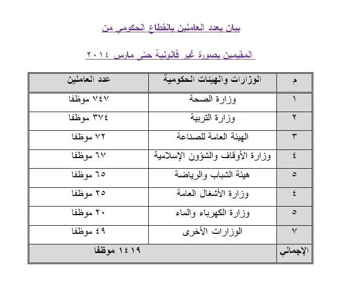 أعلن الجهاز المركزي لمعالجة أوضاع المقيمين بصورة غير قانونية ارتفاع عدد العاملين المدنيين لدى الجهات الحكومية من أبناء المقيمين بصورة غير قانونية الى 1419 موظفا وموظفة.