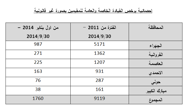 أعلن الجهاز المركزي لمعالجة أوضاع المقيمين بصورة غير قانونية اصدار 1760 رخصة قيادة لمقيمين بصورة غير قانونية خلال الأشهر التسعة الأولى من عام 2014 بالتعاون مع الادارة العامة للمرور في وزارة الداخلية.