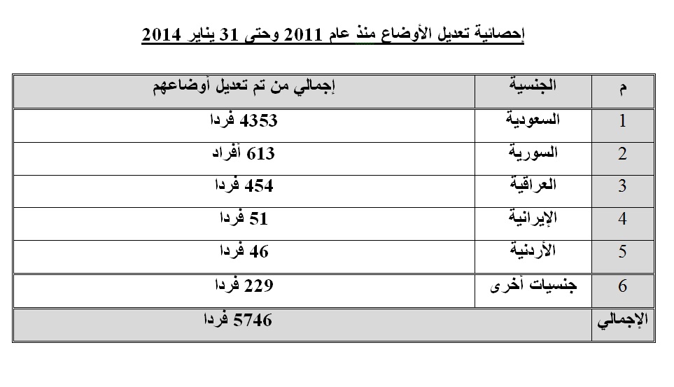 أعلن الجهاز المركزي لمعالجة أوضاع المقيمين بصورة غير قانونية اليوم عن وصول عدد من تم تعديل أوضاعهم منذ انشاء الجهاز وحتى نهاية شهر يناير الماضي الى 5746 فردا.