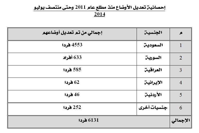 وقال مدير ادارة تعديل الاوضاع بالإنابة في الجهاز المقدم خالد المغربي لوكالة الأنباء الكويتية (كونا) اليوم ان 4553 شخصا من المقيمين بصورة غير قانونية عدلوا أوضاعهم الى الجنسية السعودية مقابل 633 شخصا عدلوا أوضاعهم الى الجنسية السورية و 585 شخصا الى الجنسية العراقية و 62 شخصا الى الجنسية الايرانية و 46 شخصا الى الجنسية الاردنية و 252 شخصا الى جنسيات أخرى.