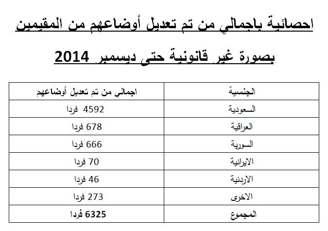 الكويت – 3 – 1 (كونا) — أعلن الجهاز المركزي لمعالجة أوضاع المقيمين بصورة غير قانونية اليوم أن 6325 فردا قاموا بتعديل أوضاعهم منذ مطلع عام 2011 وحتى نهاية شهر ديسمبر 2014.
