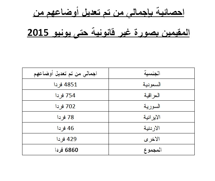 أعلن الجھاز المركزي لمعالجة أوضاع المقیمین بصورة غیر قانونیة الیوم أن 6860 شخصا من فئة المقیمین بصورة غیر قانونیة عدلوا أوضاعھم منذ أوائل عام 2011 وحتى نھاية يونیو 2015.