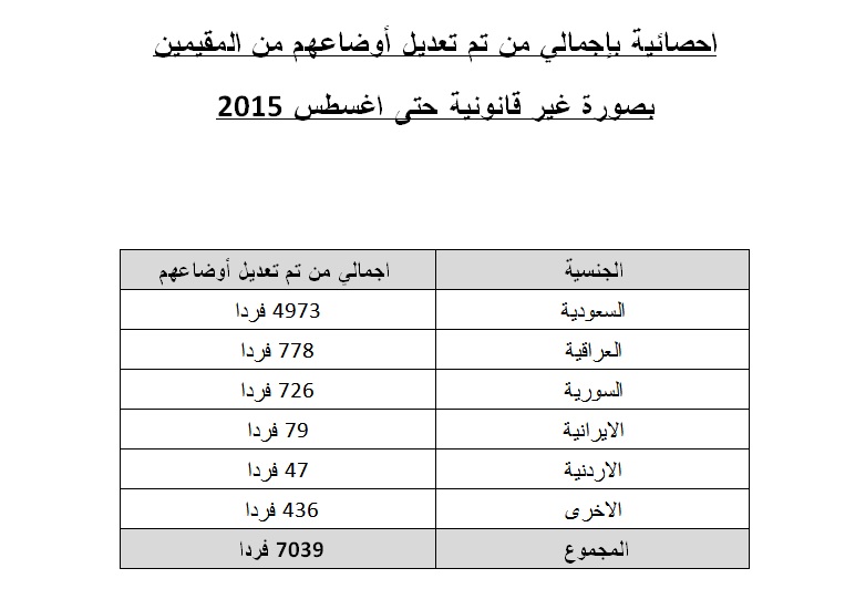 وأضاف الوھیب أن 79 فردا عدلوا أوضاعھم إلى الجنسیة الإيرانیة و 47 إلى الجنسیة الأردنیة إلى جانب 436 فردا عدلوا أوضاعھم إلى جنسیات أخرى.