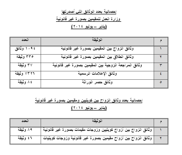 وقال مدير إدارة التوثيقات الشرعية في وزارة العدل وليد خالد المواش لوكالة الأنباء الكويتية (كونا) ان إدارة التوثيقات الشرعية وفروعها أصدرت 1094 وثيقة زواج و335 وثيقة طلاق و37 وثيقة مراجعة زوجية للمقيمين بصورة غير قانونية خلال الفترة بين شهري يناير ويوليو الماضيين.