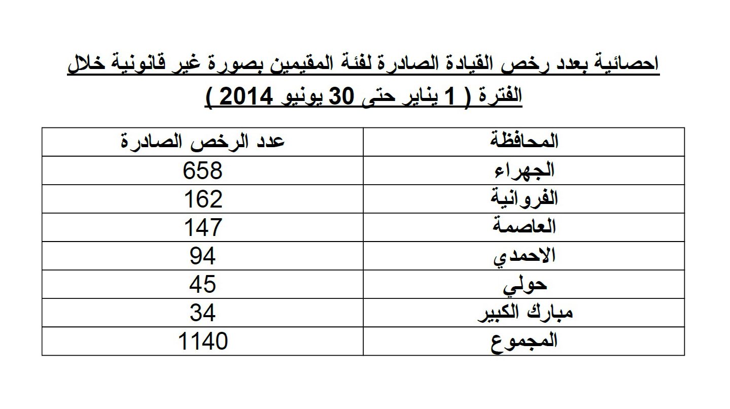 وقال الفرحان لوكالة الانباء الكويتية (كونا) اليوم ان الفترة الممتدة بين أول يناير الماضي حتى آخر شهر يونيو الماضي شهدت اصدار 1140 رخصة قيادة لفئة المقيمين بصورة غير قانونية منها 565 رخصة قيادة صدرت خلال أشهر ابريل مايو ويونيو الماضية.