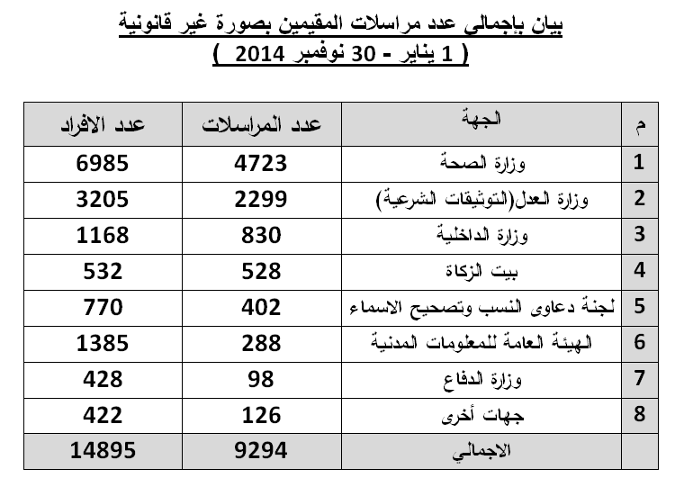 أعلن الجهاز المركزي لمعالجة أوضاع المقيمين بصورة غير قانونية اليوم اصدار 9294 مراسلة لعدد من الجهات المختصة بإنجاز معاملات المقيمين بصورة غير قانونية خلال الفترة من أول يناير من عام 2014 وحتى اخر نوفمبر من العام نفسه. Continue reading “الجهاز المركزي يصدر 9294 مراسلة لإنجاز معاملات المقيمين بصورة غير قانونية”