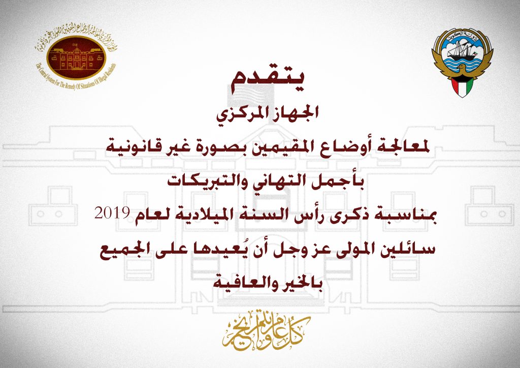 يتقدم الجهاز المركزي لمعالجة أوضاع المقيمين بصورة غير قانونية بخالص التهاني والتبريكات بمناسبة ذكرى رأس السنة الميلادية لعام 2019.سائلين المولى عز وجل أن يُعيدها على الجميع بالخير والعافية.
