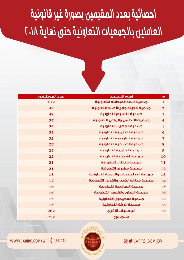 واضاف العازمي ان جمعية الاندلس والرقعي جاءت بالمرتبة الرابعة ب37 موظفا ثم جمعية الجهراء ب34 موظفا وجمعية الصليبية ب33 موظفا وتوزع الباقون على الجمعيات الأخرى مبينا ان عدد الجمعيات المشاركة في آلية التوظيف بلغ 46 جمعية.